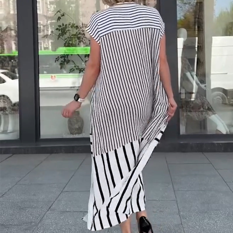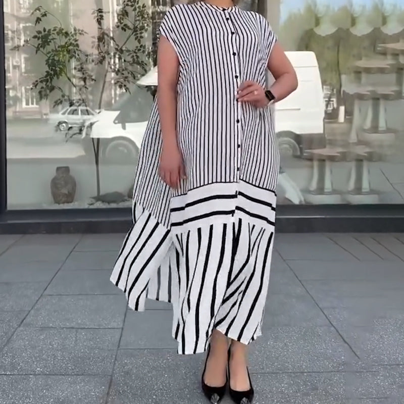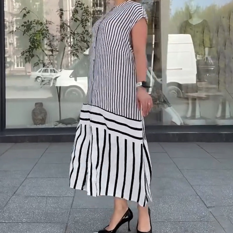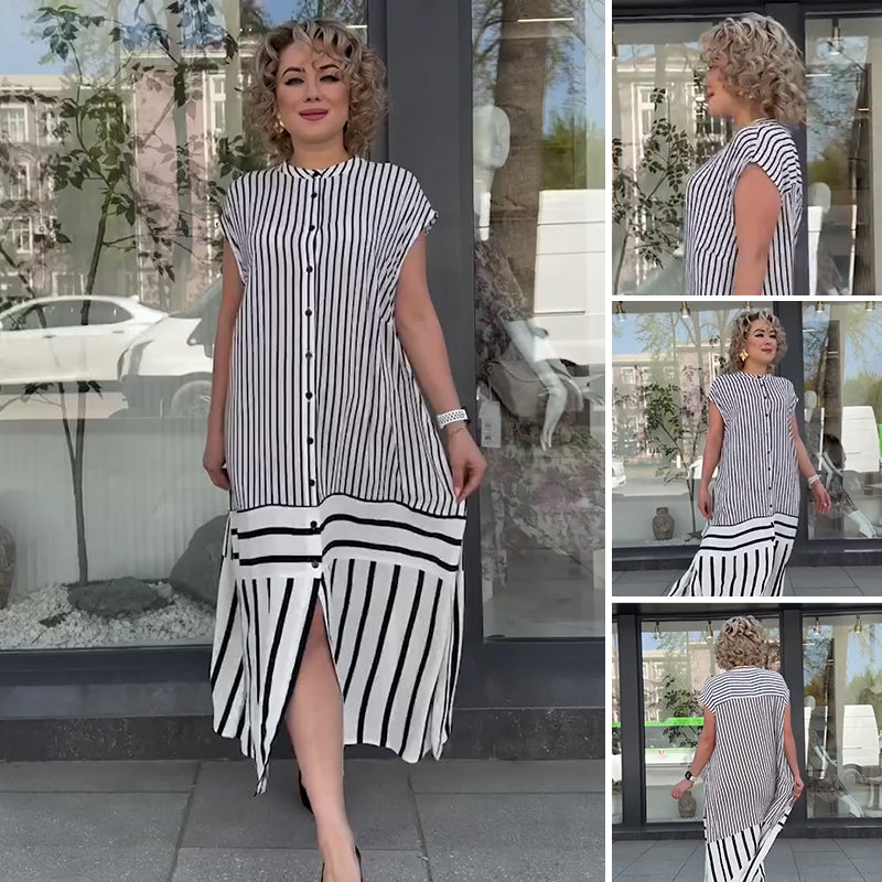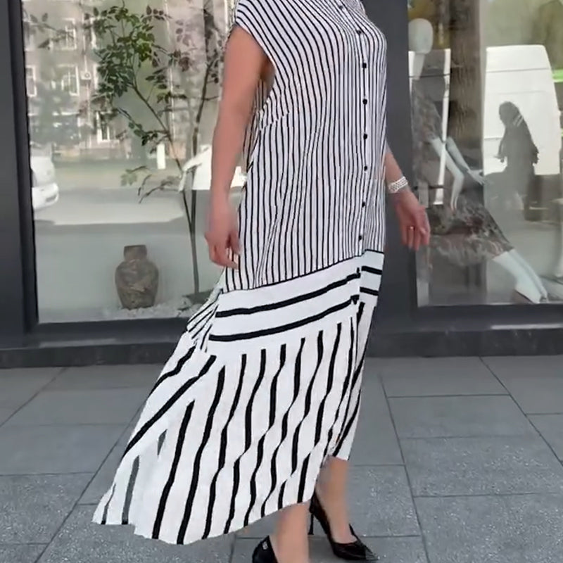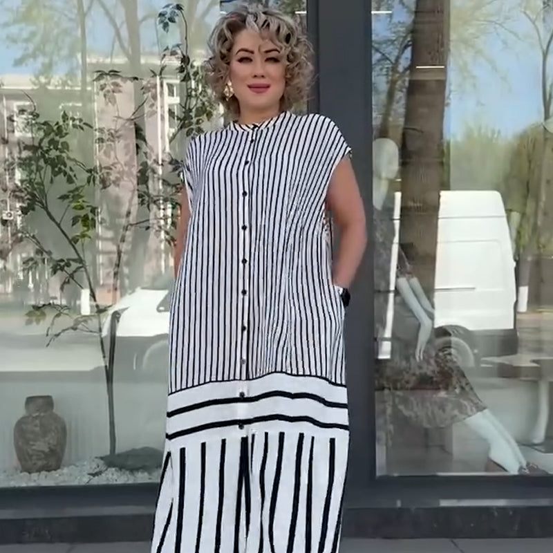 Zestaw zawiera: 1× Długa, luźna sukienka w paski zapinana na guziki