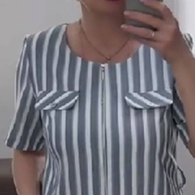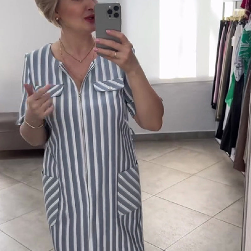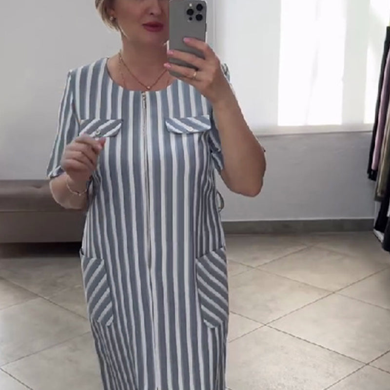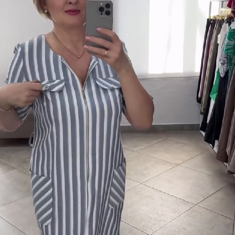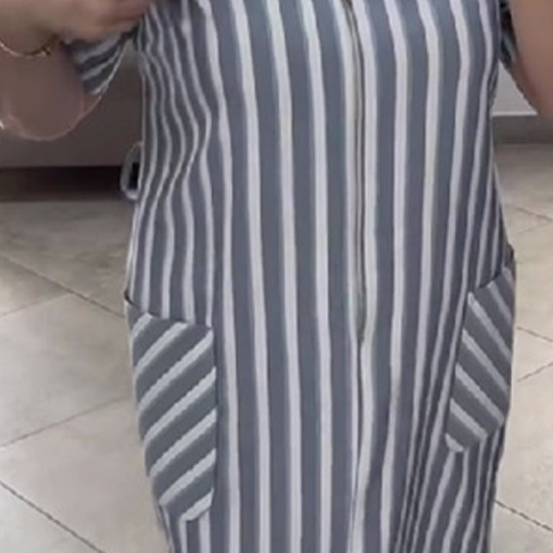 RELAKSUJĄCA SYLWETKA & PRAKTYCZNY DESIGN - Ta luźna sukienka ma wygodny, luźny krój z okrągłym dekoltem, oferując zarówno styl, jak i swobodę ruchów. Pionowe paski biegną wzdłuż ubrania, tworząc ponadczasową estetykę.