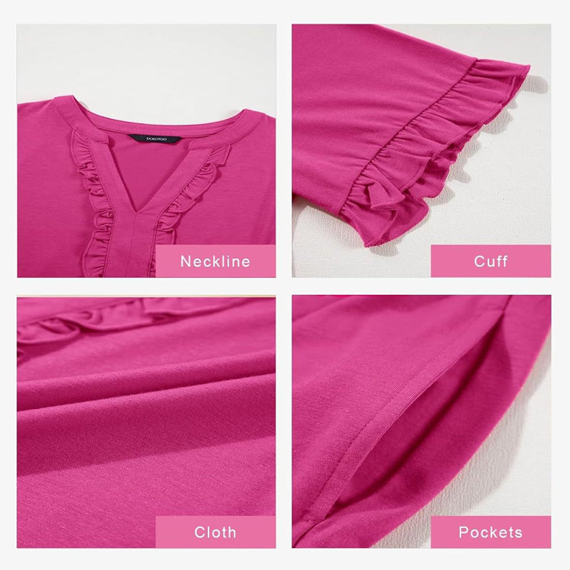 UROCZE FALBANY: Subtelne falbany wzdłuż dekoltu w kształcie litery V i dołu sukienki dodają jej zalotnego, kobiecego charakteru, który podkreśla jej niewymuszoną elegancję. Idealna do dodania osobowości bez nadmiernego krzykliwości.