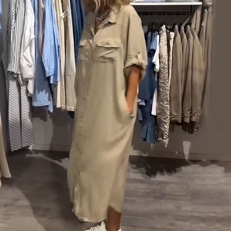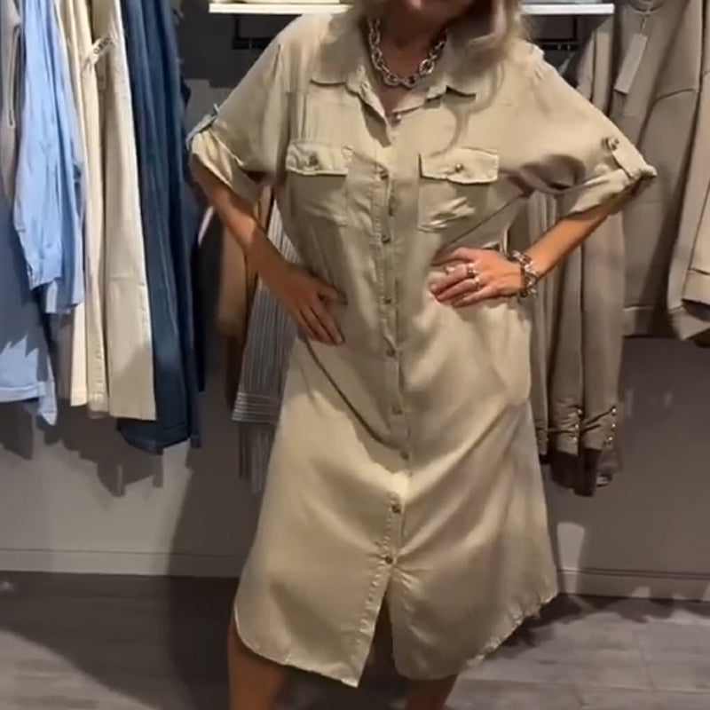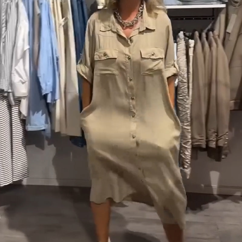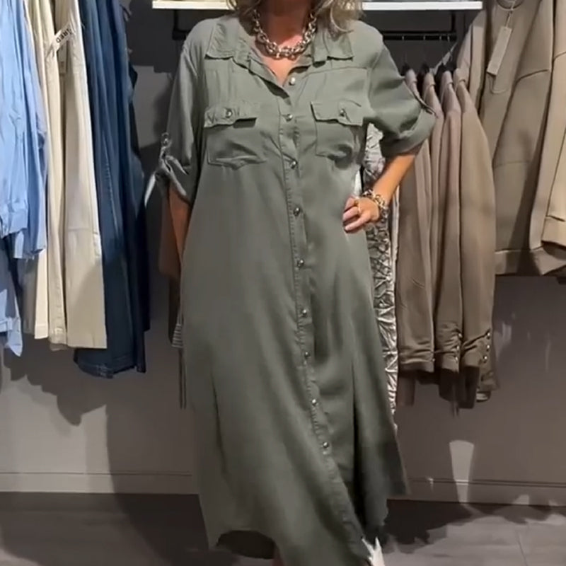ZAPIĘCIE NA GUZIKI NA CAŁEJ DŁUGOŚCI – Sukienka ma zapięcie na guziki od kołnierza aż do dołu, co pozwala dopasować wygląd do własnych preferencji – zapinaj na wszystkie guziki dla eleganckiego efektu lub pozostaw rozpiętą dla warstwowego stylu. To praktyczne rozwiązanie ułatwia też szybkie zakładanie i zdejmowanie oraz daje kontrolę nad poziomem zakrycia i wentylacji.