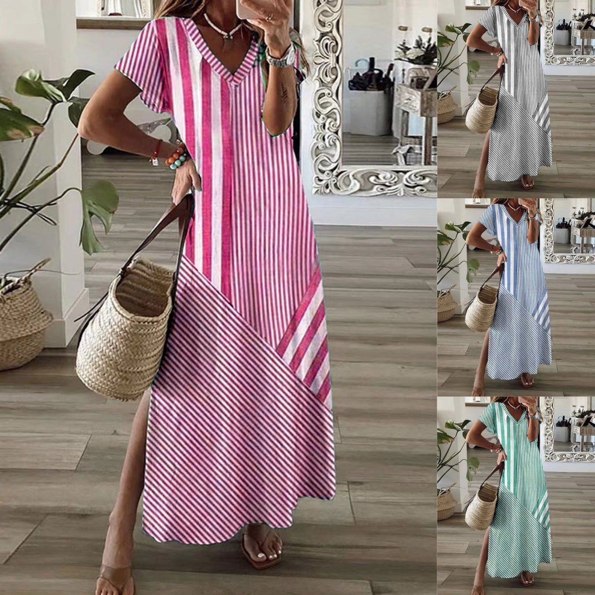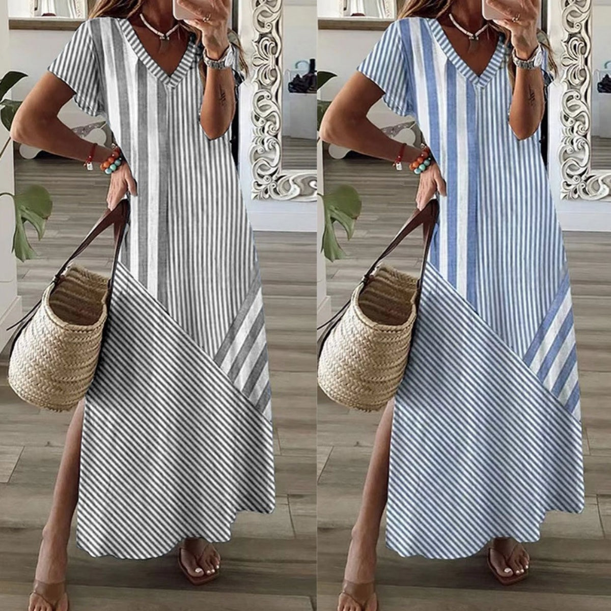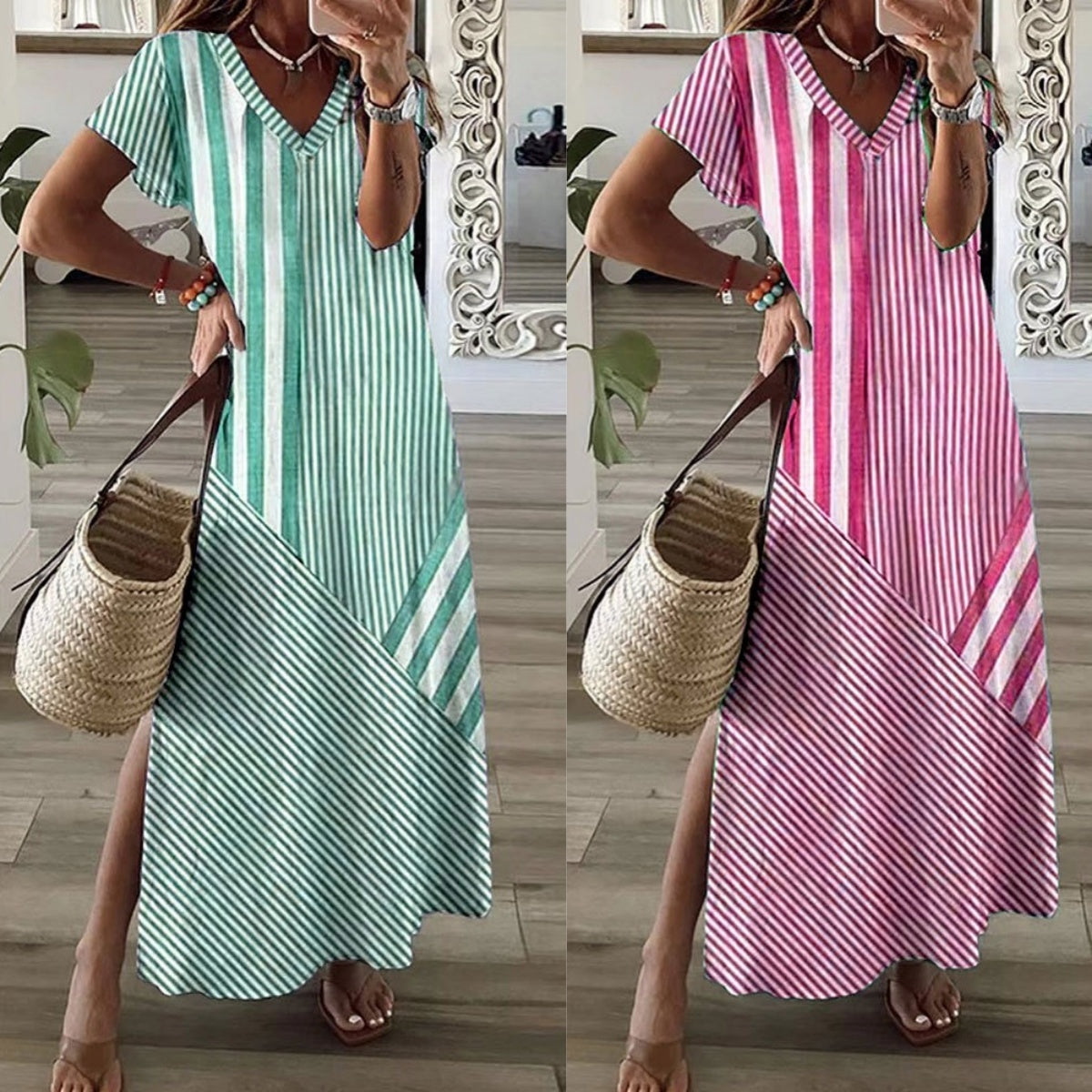W skład zestawu wchodzą: 1* Damska sukienka w paski z dekoltem w serek i rozcięciem