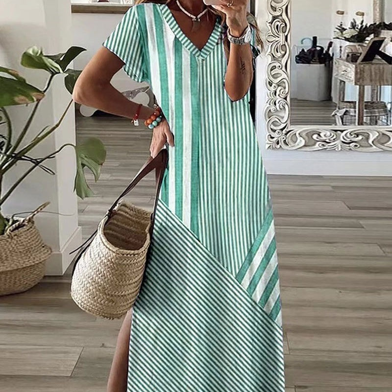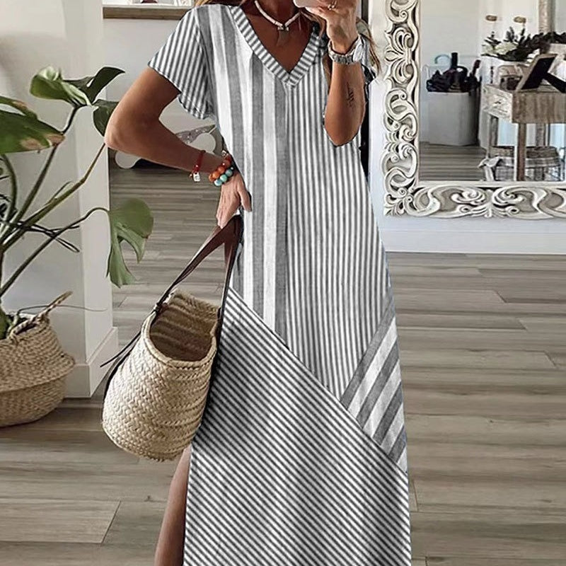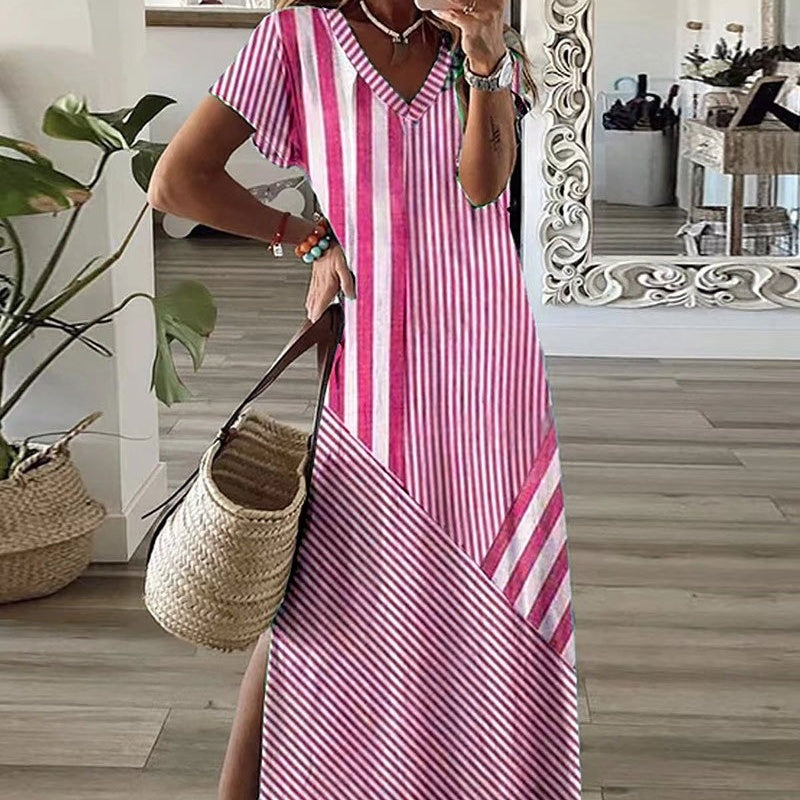 Sukienka damska w paski z dekoltem w serek i rozcięciem