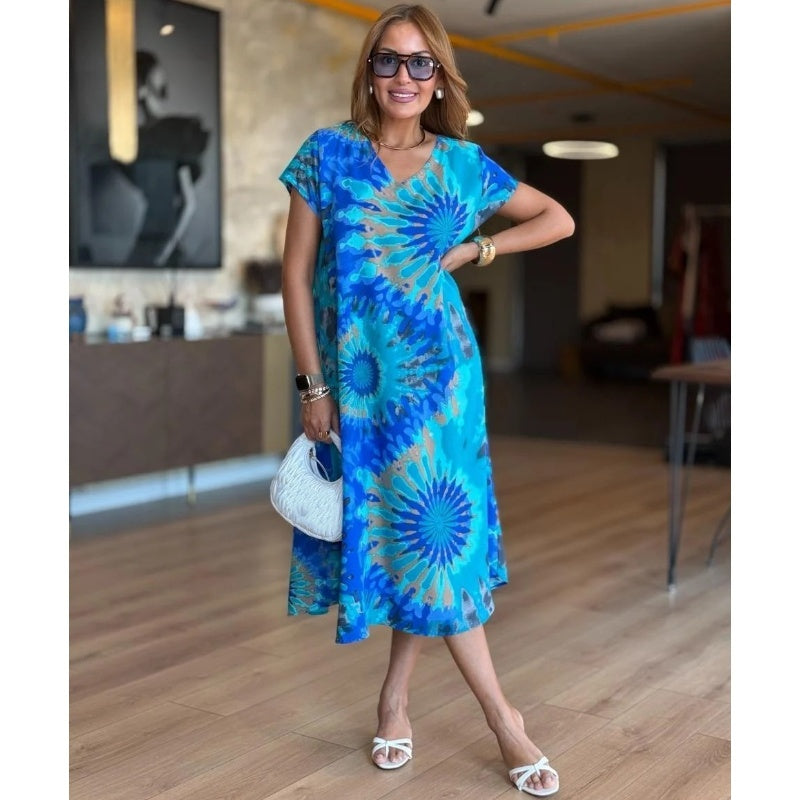 S-4XL 🌼Damska sukienka maxi z nadrukiem z dekoltem w serek