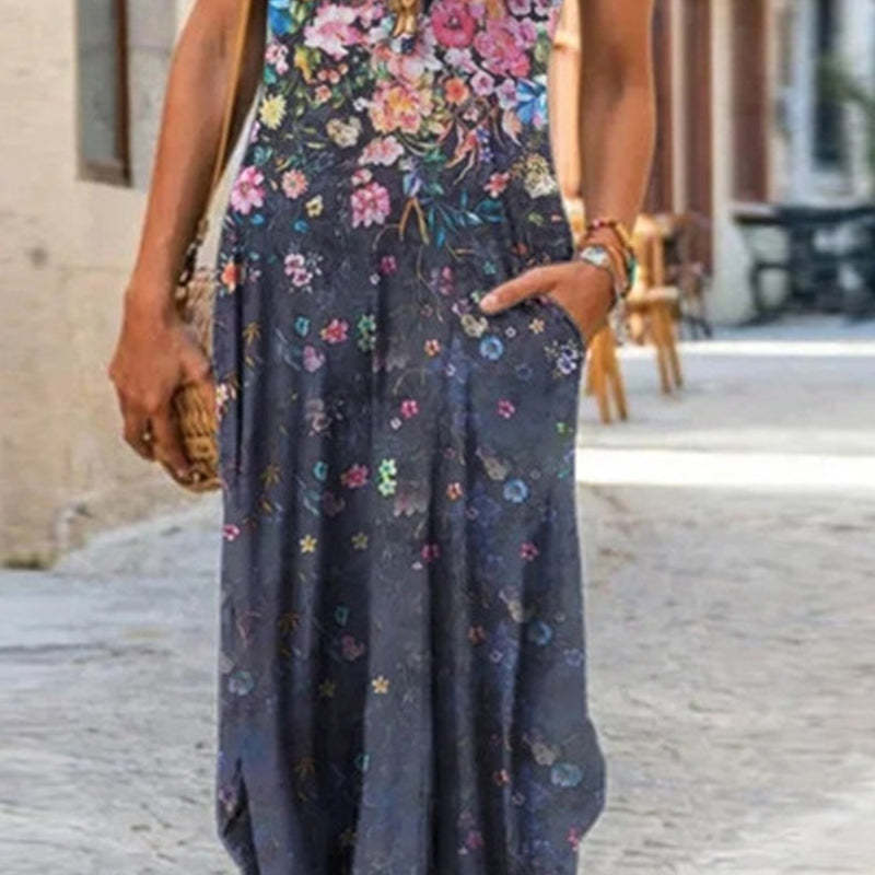 Piękny, całkowicie pokrywający kwiatowy nadruk oraz długi fason, który lekko opływa sylwetkę, łącząc elegancję z codzienną wygodą.