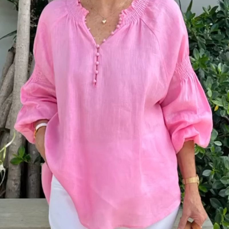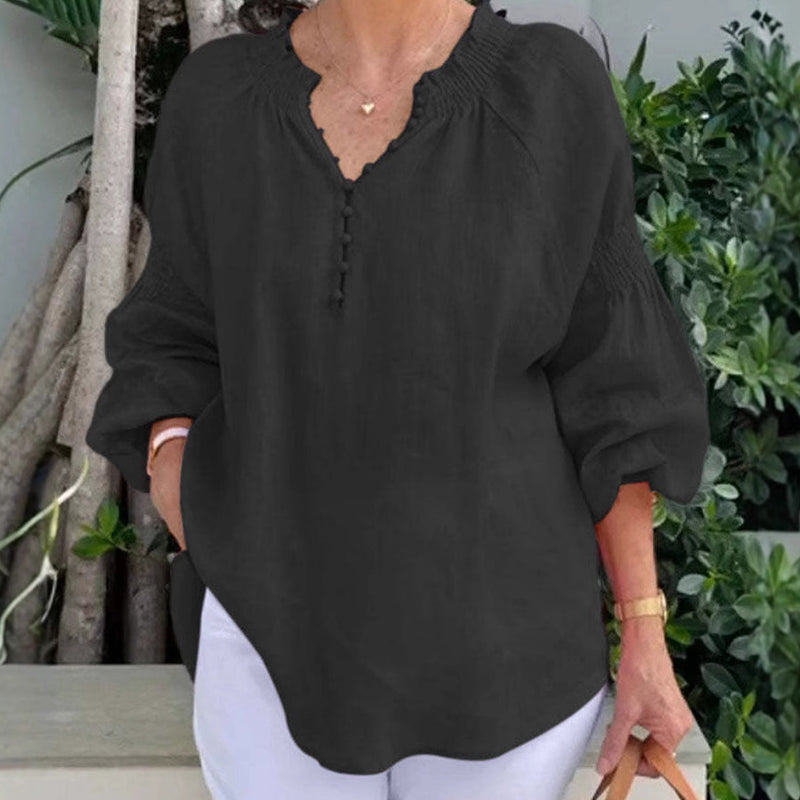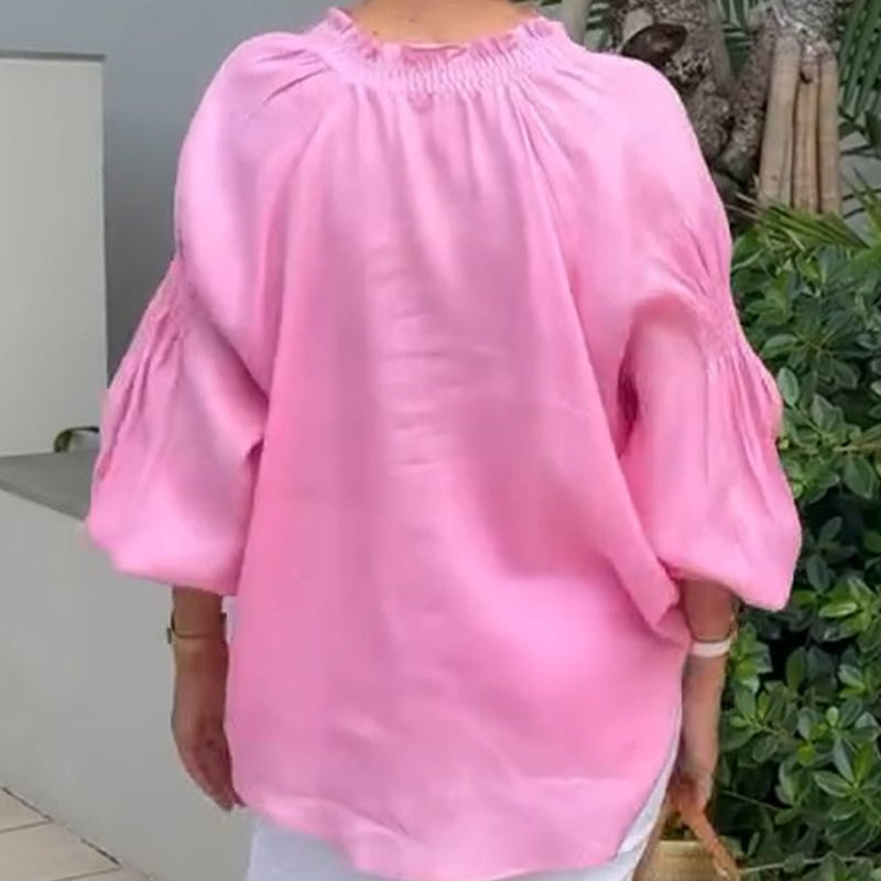 PŁASKIE RUKOWANE DETALE- Piękne, marszczone detale wzdłuż kołnierza i rękawów dodają wyjątkowego, stylowego akcentu i tworzą pochlebny kształt, zachowując jednocześnie swobodny, swobodny klimat.