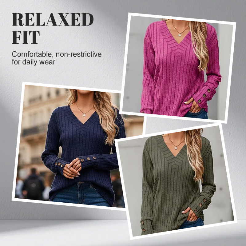 CLASSIC V-NECK & CUFF BUTTONS: The V-neckline creates a flattering opening, while each cuff features three decorative buttons for a polished look. These details enhance elegance without affecting functionality.