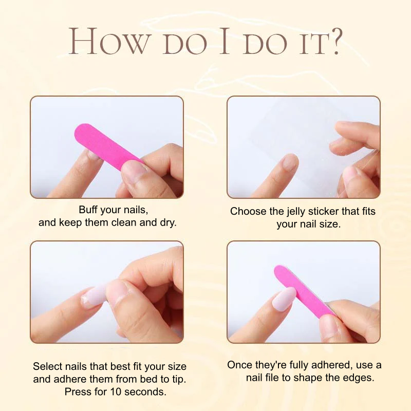 • Żelowe naklejki nadają się do krótkotrwałego noszenia i ponownego użycia. Do dłuższego utrzymania zaleca się użycie osobnego kleju do paznokci.